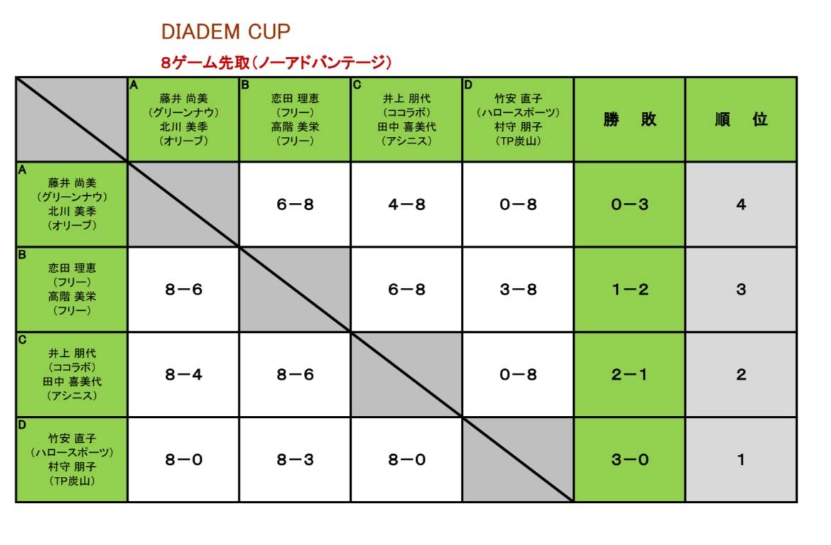 DIADEM CUP第2戦開催! 2025/05/17 5月16日(金)DIADEM CUP第2戦が開催されました、4チームでのリーグ戦にて竹安、村守ペアが全勝優勝されました! 上位3チームはファイナルステージ進出の権利を獲得されました。 第3戦は7/18(金)です!エントリーお待ち致しております!! 3位 恋田理恵、高階美栄(フリー) 4位 藤井尚美(グリーンナウ)、北川美季(オリーブ)