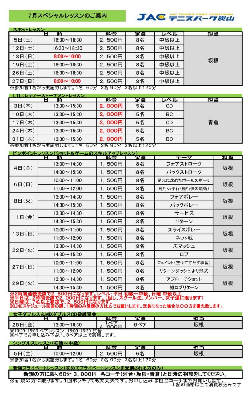 7月スペシャルレッスンのご案内です。