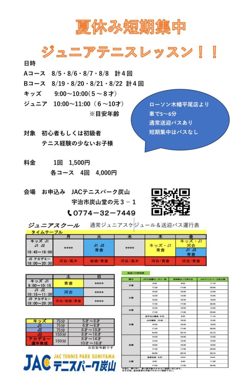夏休み短期集中ジュニアレッスン 2025/07/13 夏休み短期集中ジュニアレッスンのご案内です。 どなたでも参加可能となっています。夏休みの思い出つくりでも大丈夫ですので、お気軽に、ぜひ一度テニスにチャレンジしてみて下さい!!