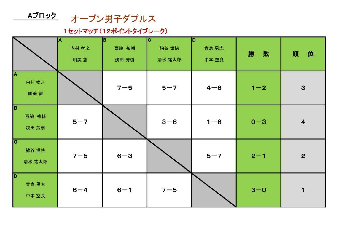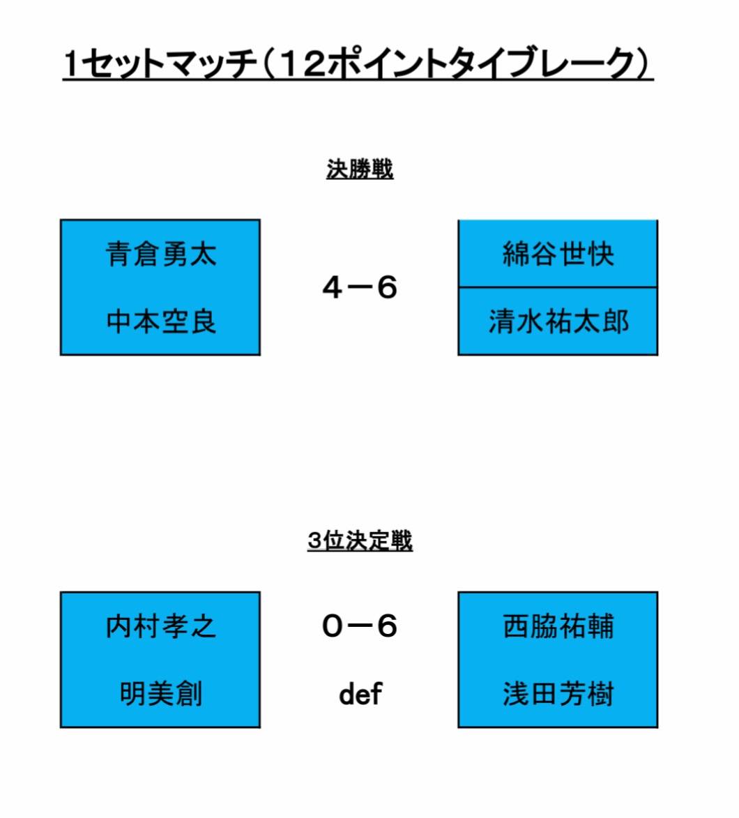 サンデーアフタヌーンイベントオープン男子ダブルス 2025/09/16 9/14オープン男子ダブルスが開催されました! 4チーム総当たりの後、1位。2位通しの決勝戦を行いジュニアチームが優勝しました🏆 4バックの試合展開も初めて見ました!(◎_◎;) 見応えのある試合が多かったです! 次回オープン男子ダブルスは、10月3日に予定しています。エントリーお待ち致しております!