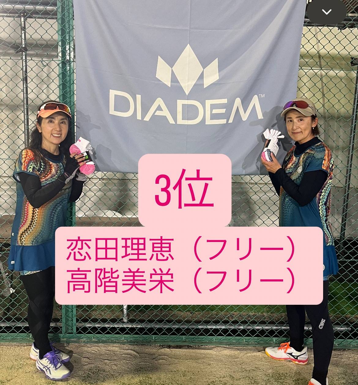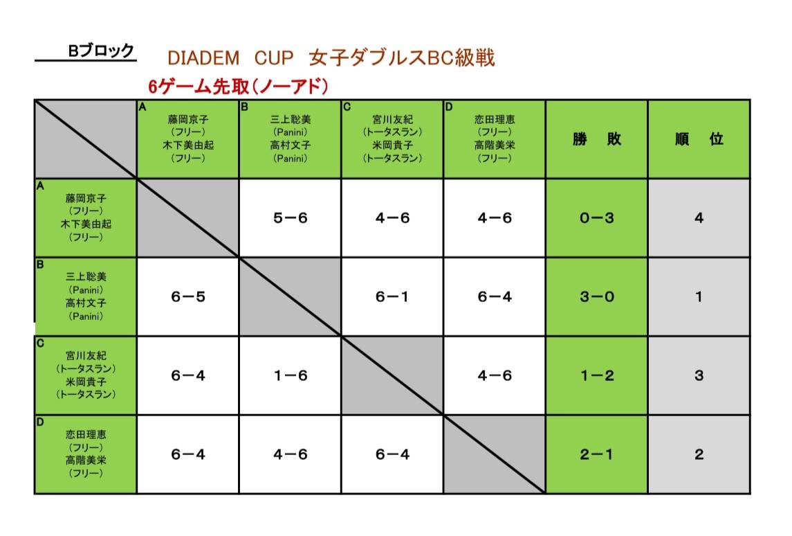 DIADEM CUP女子ダブルスBC級戦ファイナルステージ 2025/11/15 11/14(金) DIADEM CUP女子ダブルスBC級戦開催されました。 予戦を勝ち抜いた8組の強豪により熱い戦いが繰り広げられました。 川島、長西ペアが頭一つ抜け出てたように思いました! 優勝ペアには、お一人15000円相当のプリンス商品券をゲットされました! 最後に、この大会に参加して頂きました選手の皆様、協賛して頂きました、グローブライド株式会社様ありがとうございました。 来年もDIADEM CUP開催します! お楽しみに!!