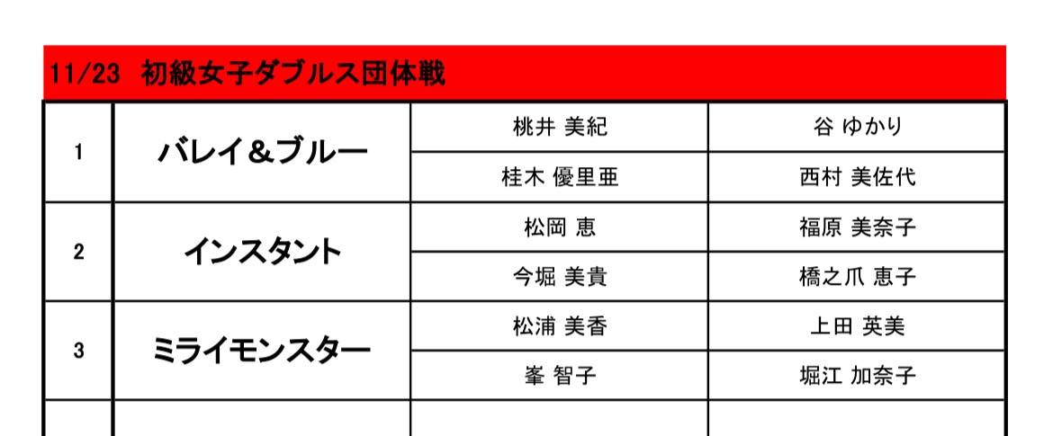 サンデーアフタヌーンイベント女子ダブルス団体戦 2025/11/24 サンデーアフタヌーンイベント初級女子ダブルス団体戦が開催されました。 エントリーが3組だったので、リーグ戦を2回行いました。 また来年も女子ダブルス団体戦を開催しますので、ぜひご参加してくださいね!