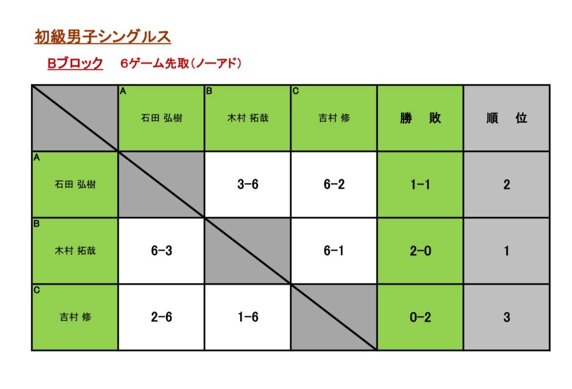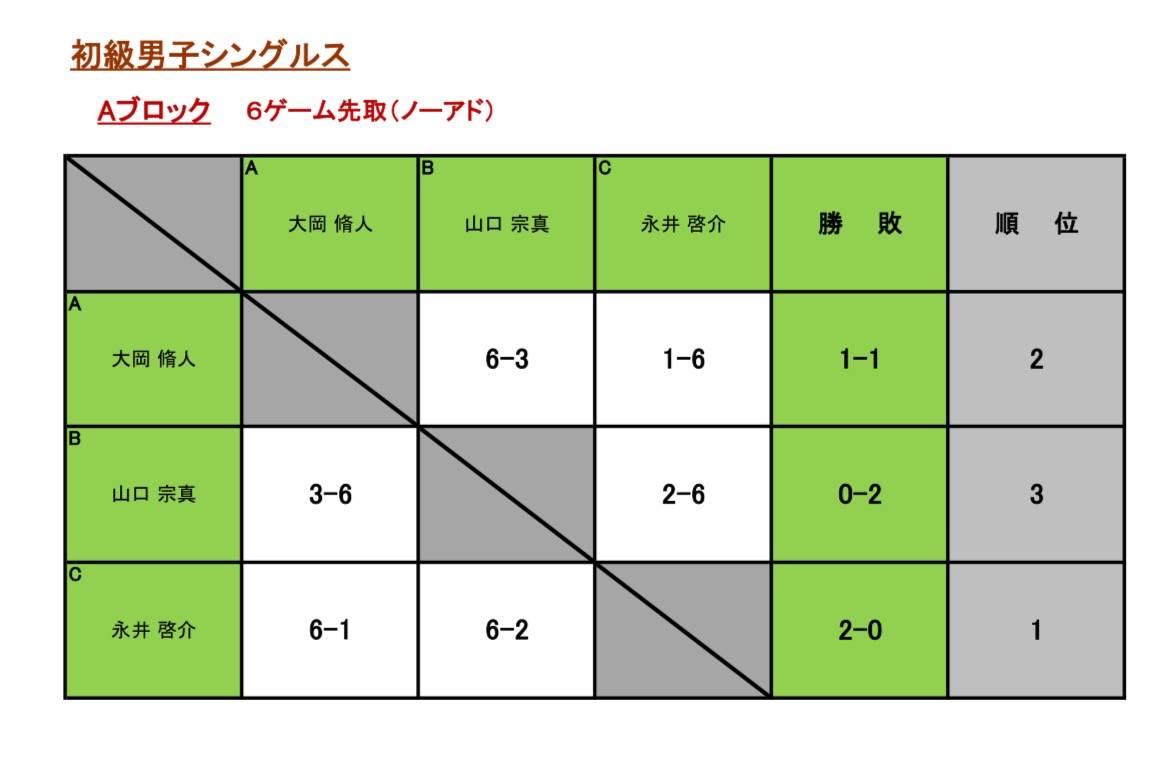 サンデーアフタヌーンイベント初級男子シングルス 2025/12/29 12/28(日)初級男子シングルスが開催されました。 優勝 永井 啓介さん 準優勝 木村 拓哉さん 次回は、1/11(日)初級男子シングス開催いたします。 お申し込みお待ち致しております。