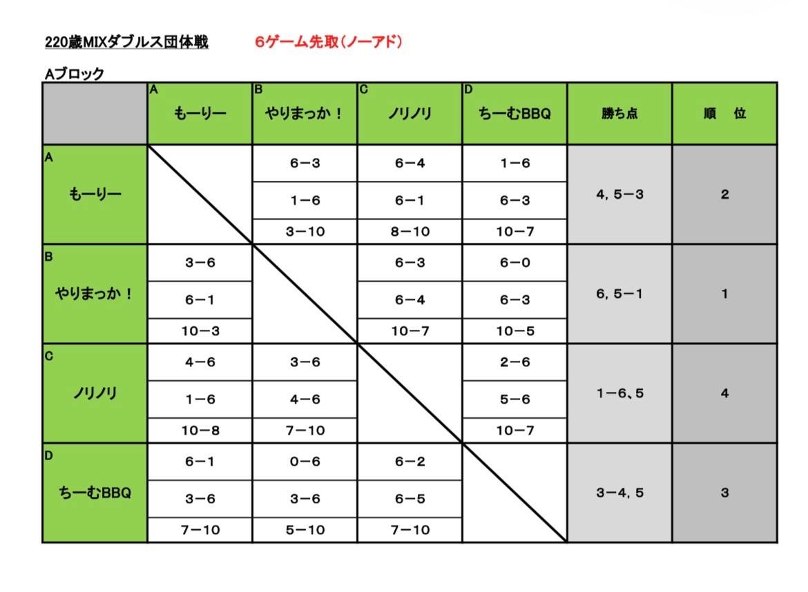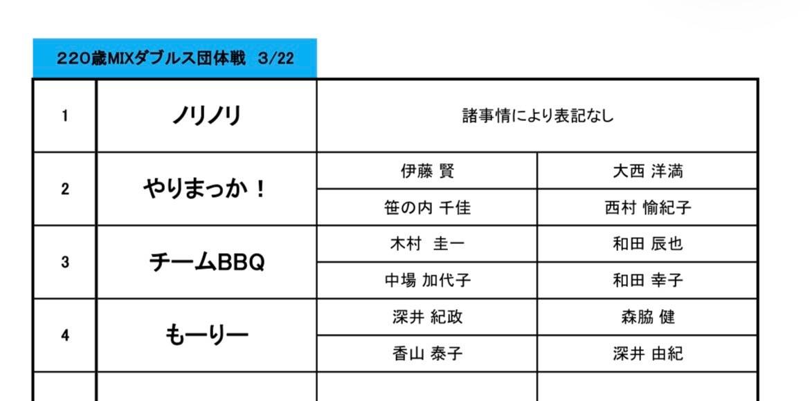 3/22 220歳MIXダブルス団体戦結果