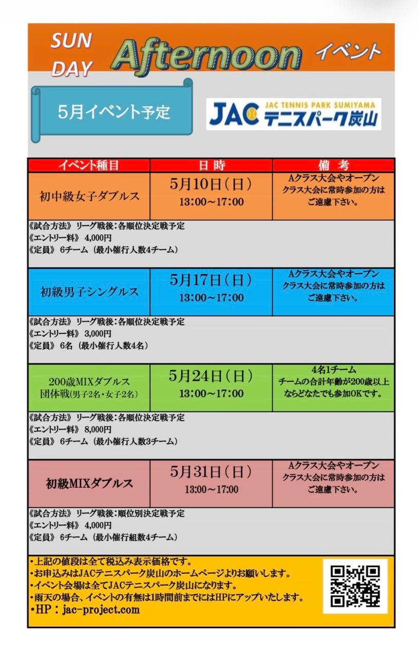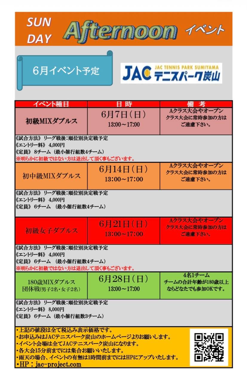 サンデーアフタヌーンイベントエントリー状況 2026/04/28 エントリー状況 5/10初中級女子ダブルス 1. 2. 3. 4. 5. 6. 5/17初級男子シングルス 1. 2. 3. 4. 5. 6. 5/24 200歳MIXダブルス 1. 2. 3. 4. 5. 6. 5/31 初級MIXダブルス 1. 2. 3. 4. 5. 6. エントリー状況 6/7初級MIXダブルス 1. 2. 3. 4. 5. 6. 6/14 初中級MIXダブルス 1. 2. 3. 4. 5. 6. 6/21初級女子ダブルス 1. 2. 3. 4. 5. 6. 6/28 180歳MIXダブルス 1. 2. 3. 4. 5. 6.