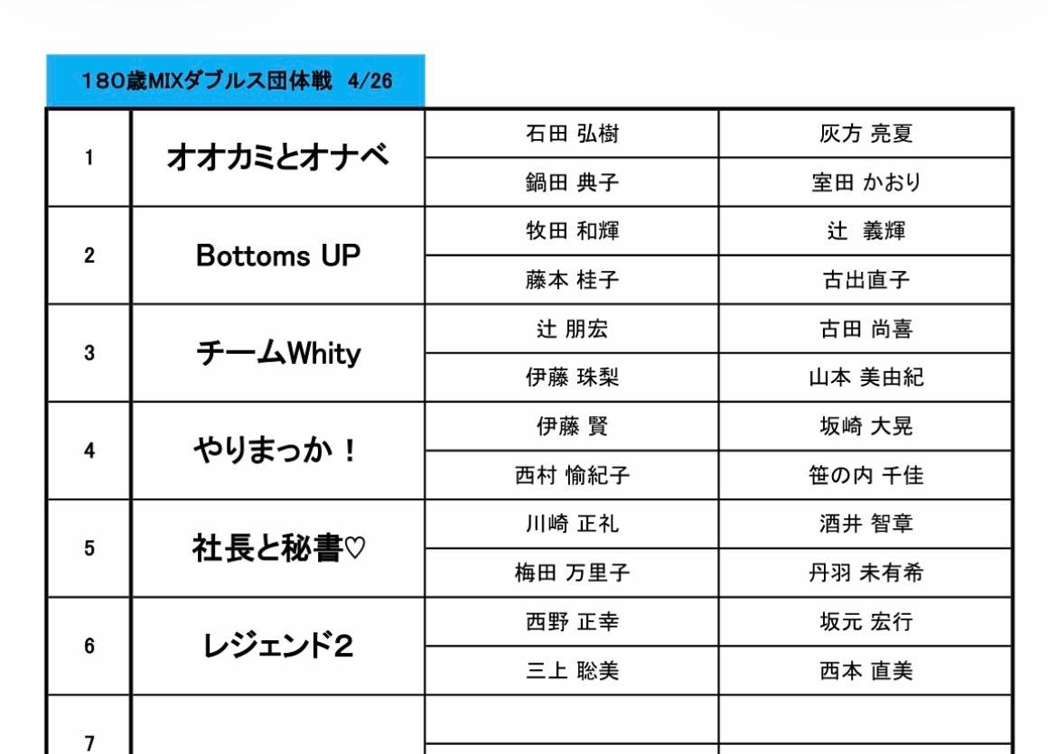 4/26 サンデーアフタヌーンイベント180歳以上MIXダブルス団体戦が開催されました。